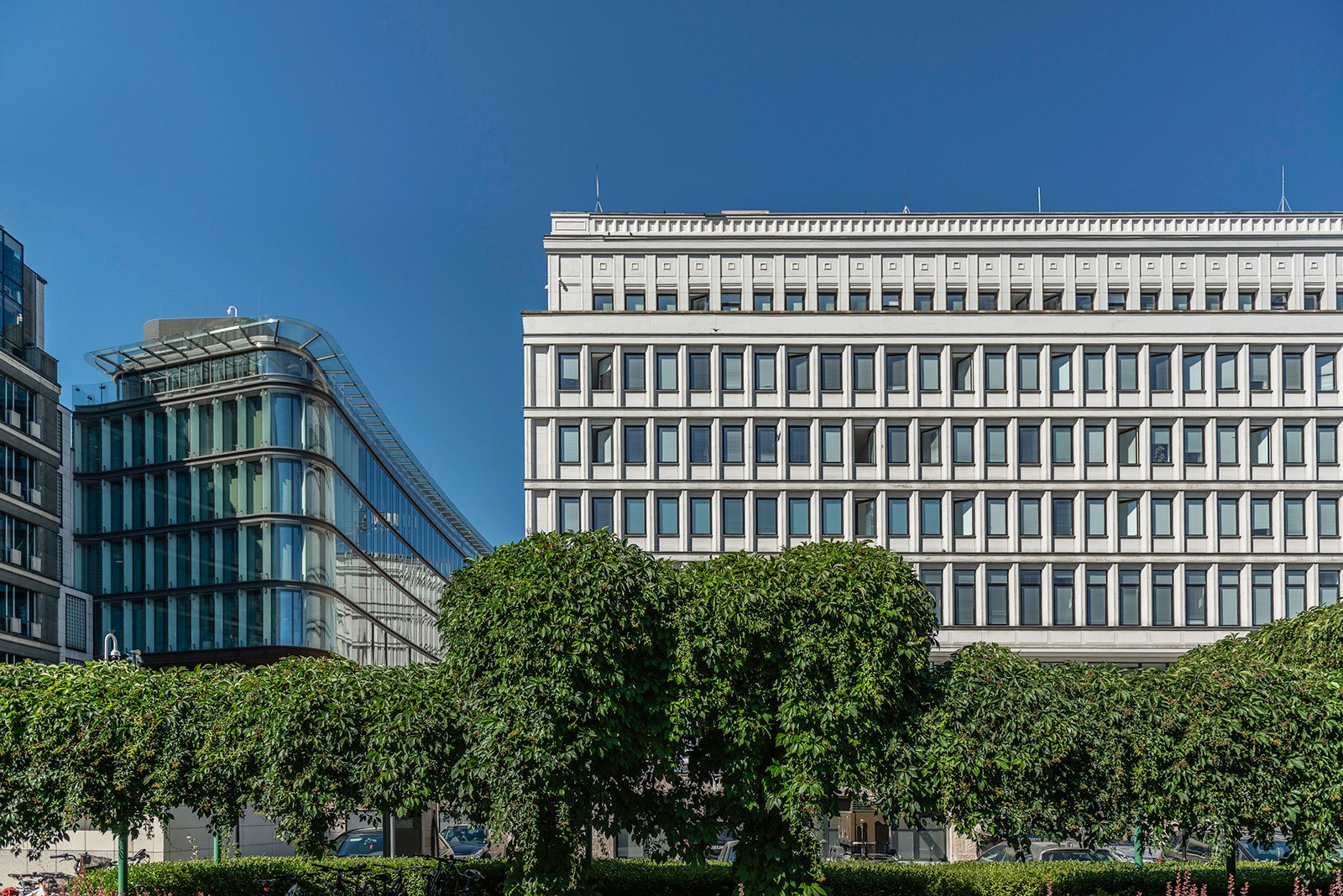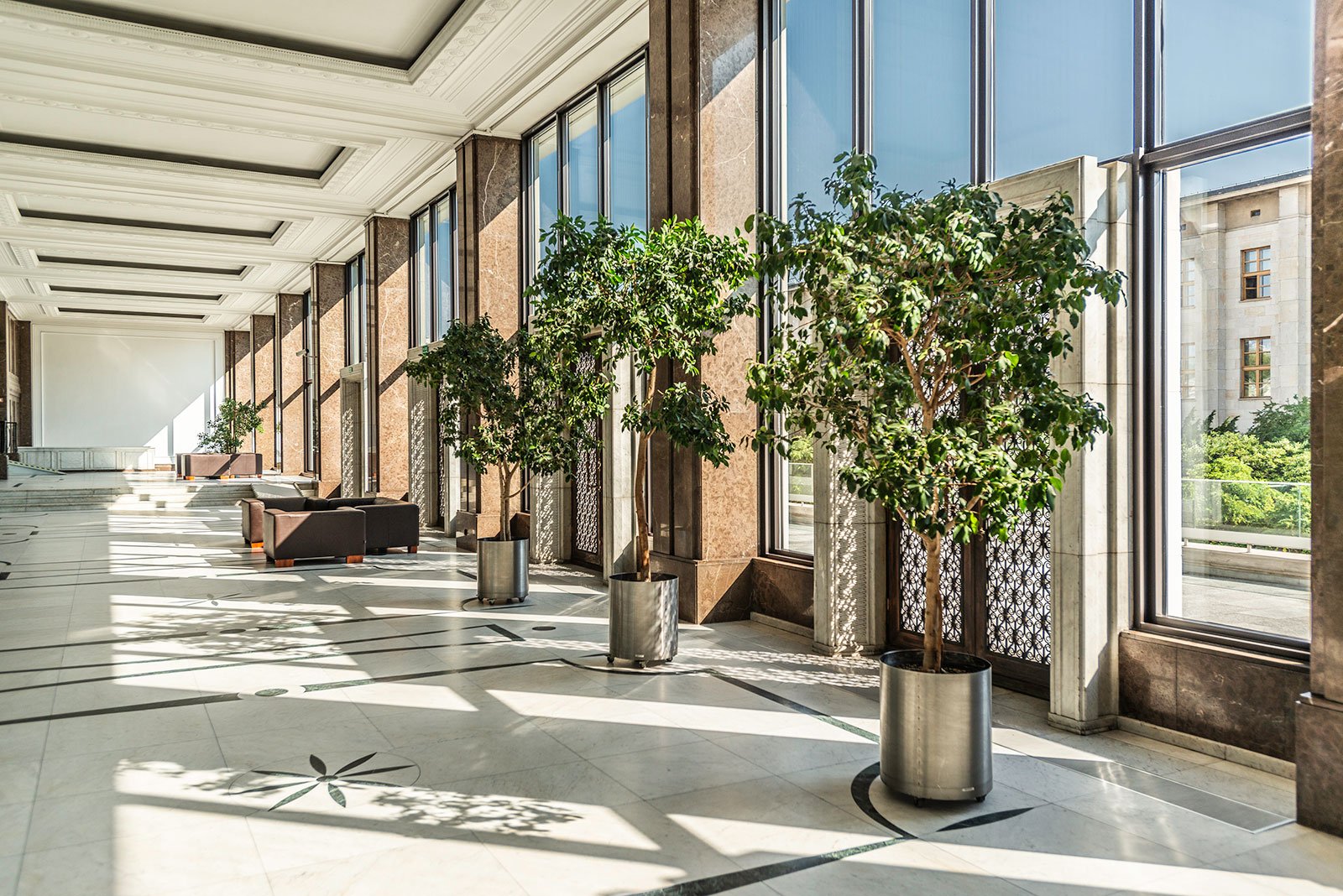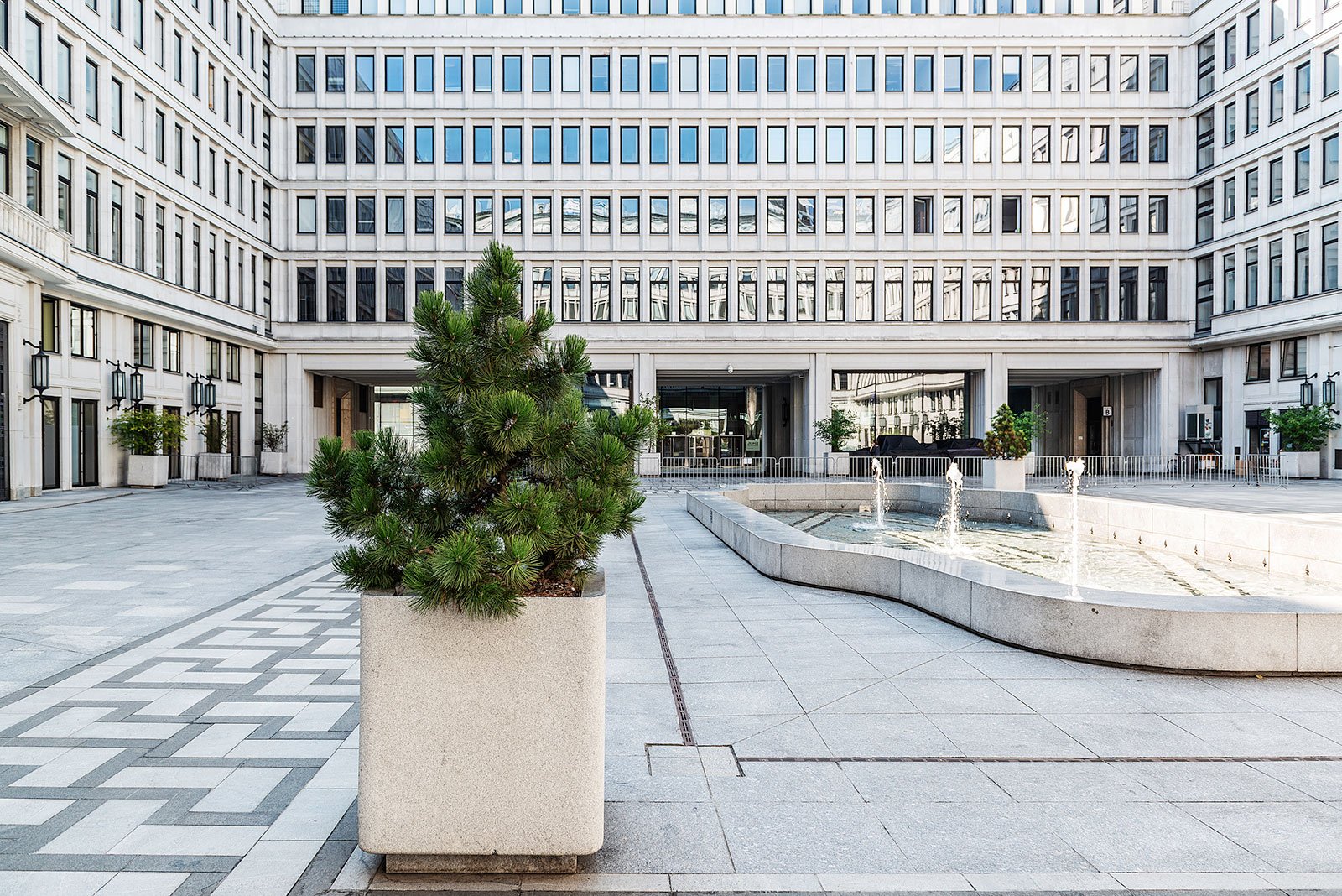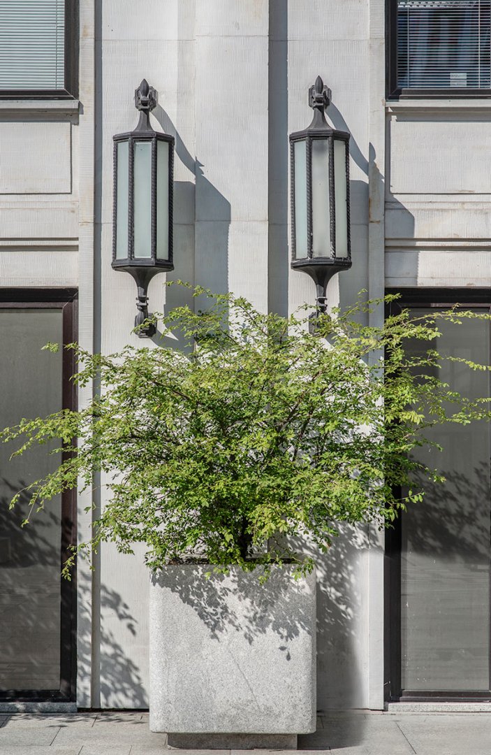 W miejscu nasadzeń wyregulowaliśmy wyrastającą roślinność. W miejscach pustych przestrzeni postawiono kamienne donice nawiązujące i utrzymujące spójność z bryłą i dziedzińcem budynku. W zależności od stopnia naświetlenia dziedzińca wprowadziliśmy zróżnicowaną roślinność, która z jednej strony nie wymagała dużej ilości światła, a z drugiej byłaby odporna na panujący w korytarzu dziedzińca przeciąg i mocne nasłonecznienie w okresie letnim. W holu galerii budynku na ścianie wschodniej wstawnione zostały donice z nasadzonymi niskopiennymi drzewami.