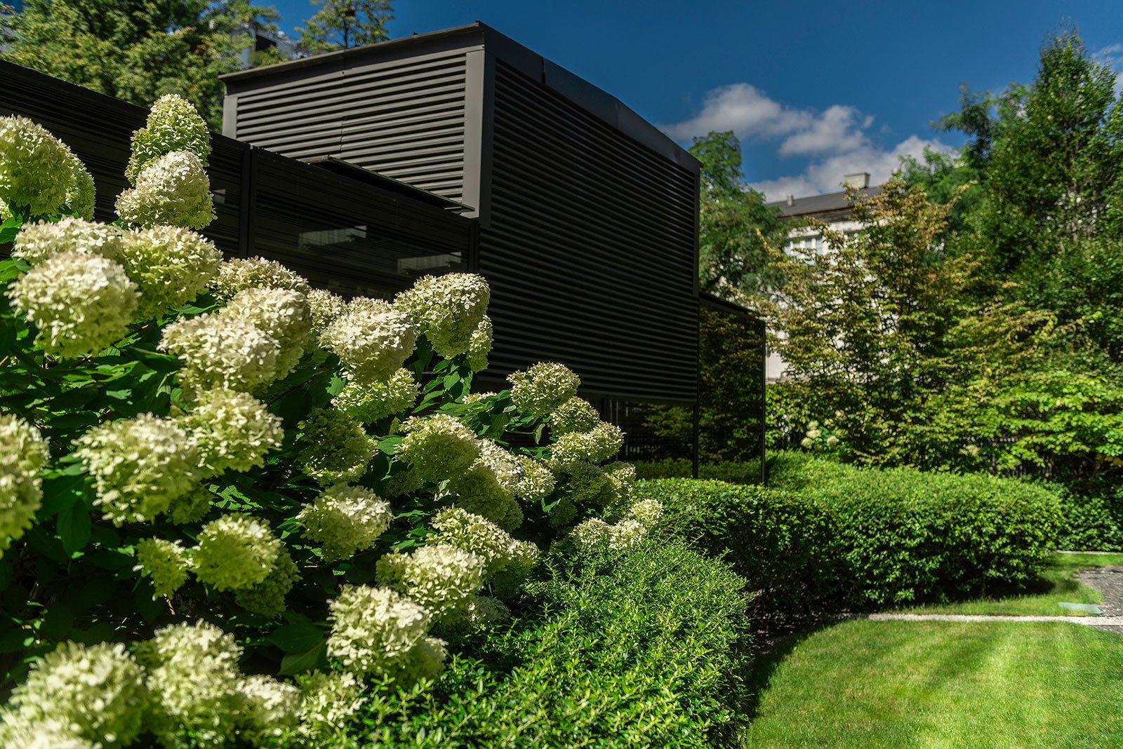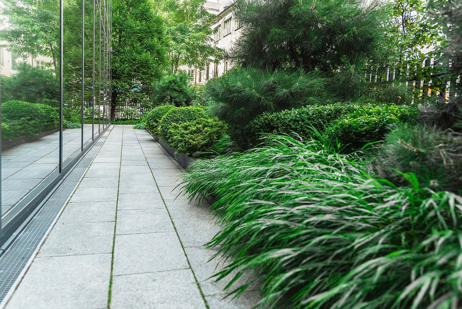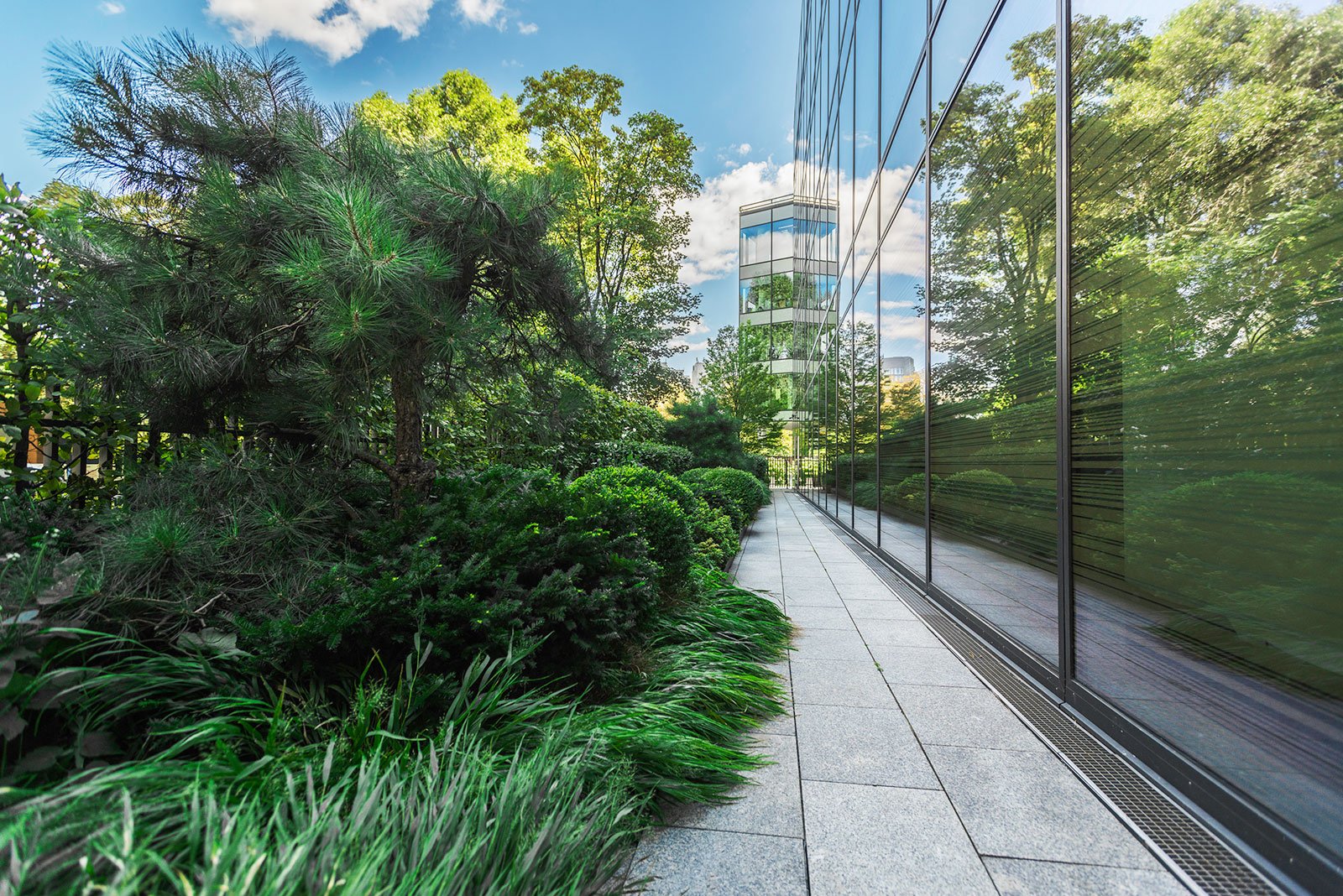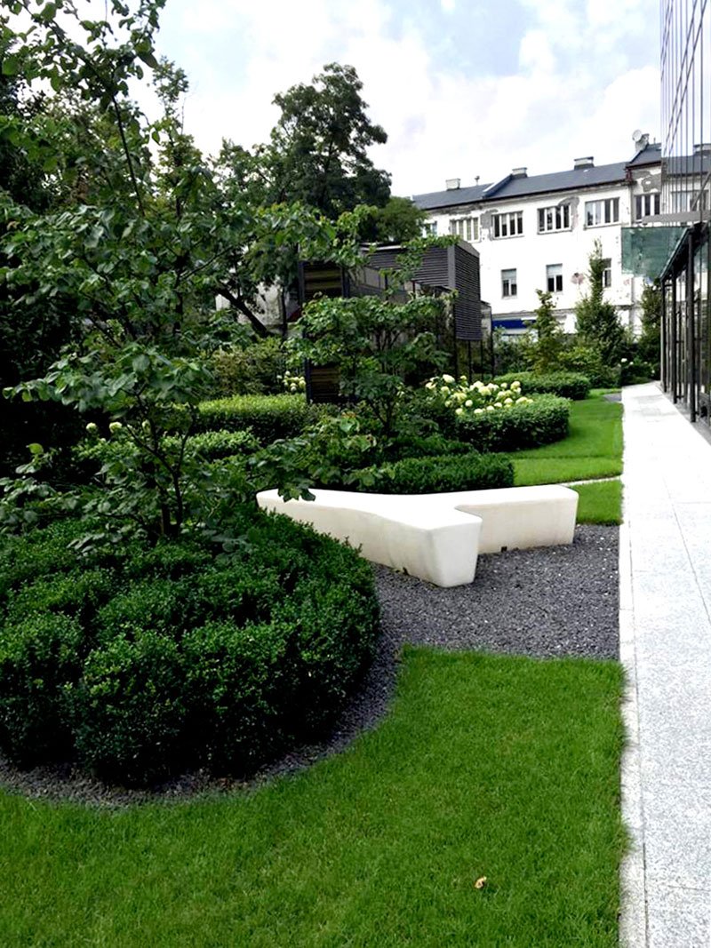 W pasach nasadzeń uporządkowano istniejącą roślinność i przygotowano podłoże pod nowe kompozycje. W miejscach o większej ekspozycji na światło ustawiono smukłe donice o geometrycznej formie, korespondujące z liniami fasady budynku. Wprowadzenie zróżnicowanych gatunków odpornych na zmienne warunki miejskie – silne nasłonecznienie, podmuchy wiatru oraz odbicia ciepła od szklanych ścian – pozwoliło zachować spójność estetyczną, a jednocześnie zwiększyć ilość zieleni. W przestrzeni lobby dodano niskopienne rośliny oraz formowane krzewy, które pełnią funkcję dyskretnej zielonej ramy, nie zakłócając transparentności i otwartości wnętrza. Całość założeń została zrealizowana z zachowaniem minimalnej ingerencji w strukturę architektoniczną budynku.