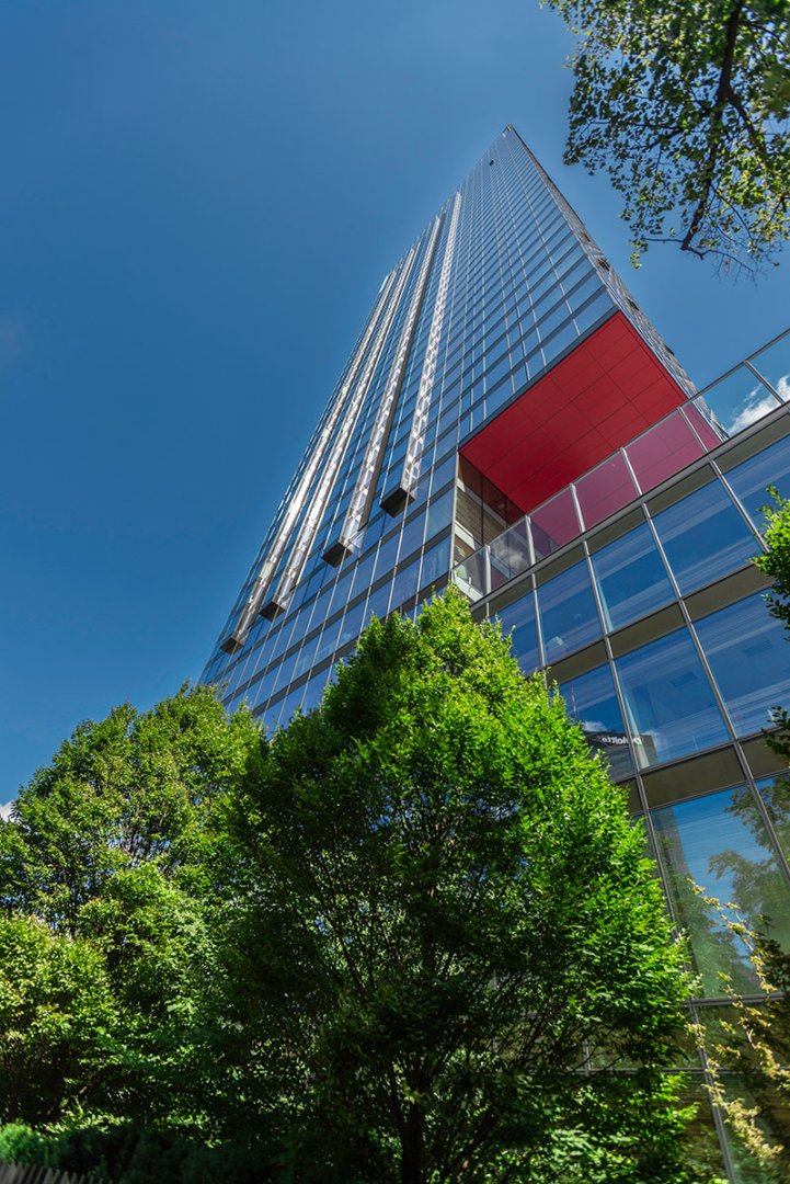Cosmopolitan to nowoczesny, przeszklony wieżowiec o minimalistycznej, eleganckiej architekturze. Jego przestrzenie wspólne – zarówno otoczenie budynku, jak i strefy wejściowe – cechują się chłodnym, urbanistycznym charakterem, w którym dominują szkło, metal i beton. Celem było wprowadzenie zieleni w sposób subtelny i nienachalny, tak by nie zaburzać architektonicznej lekkości obiektu, a jednocześnie stworzyć elementy, które ocieplą odbiór przestrzeni i dodadzą jej bardziej przyjaznego, miejskiego rytmu.
