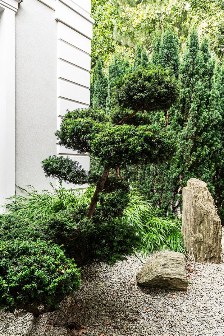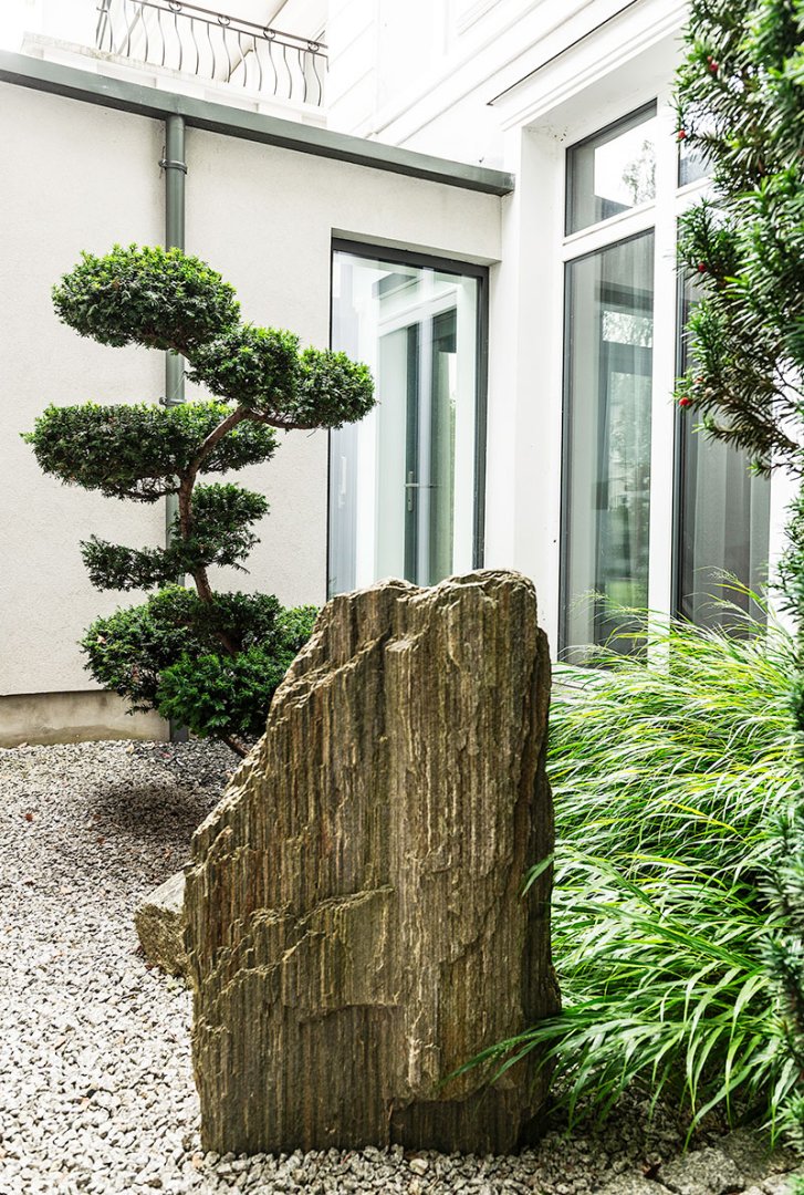 W miejscu nasadzeń wyregulowaliśmy wyrastającą roślinność. W miejscach pustych przestrzeni postawiono kamienne donice nawiązujące i utrzymujące spójność z bryłą i dziedzińcem budynku. W zależności od stopnia naświetlenia dziedzińca wprowadziliśmy zróżnicowaną roślinność, która z jednej strony nie wymagała dużej ilości światła, a z drugiej byłaby odporna na panujący w korytarzu dziedzińca przeciąg i mocne nasłonecznienie w okresie letnim. W holu galerii budynku na ścianie wschodniej wstawnione zostały donice z nasadzonymi niskopiennymi drzewami.