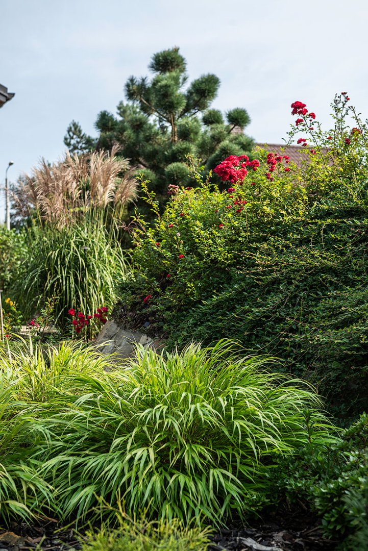 W miejscu nasadzeń wyregulowaliśmy wyrastającą roślinność. W miejscach pustych przestrzeni postawiono kamienne donice nawiązujące i utrzymujące spójność z bryłą i dziedzińcem budynku. W zależności od stopnia naświetlenia dziedzińca wprowadziliśmy zróżnicowaną roślinność, która z jednej strony nie wymagała dużej ilości światła, a z drugiej byłaby odporna na panujący w korytarzu dziedzińca przeciąg i mocne nasłonecznienie w okresie letnim. W holu galerii budynku na ścianie wschodniej wstawnione zostały donice z nasadzonymi niskopiennymi drzewami.
