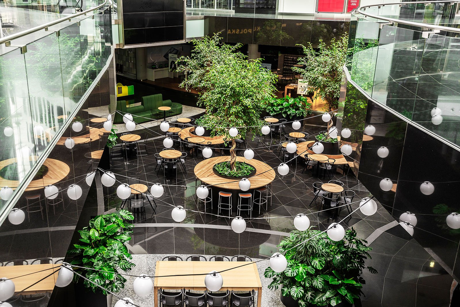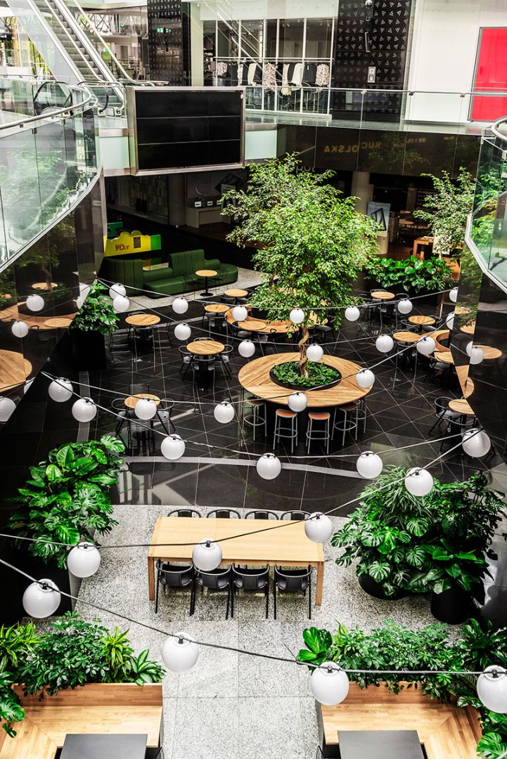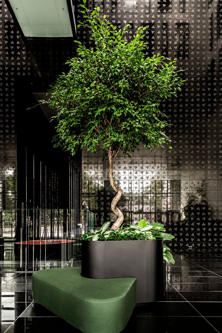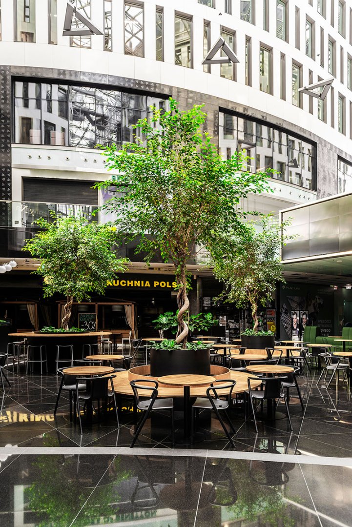 W miejscu nasadzeń wyregulowaliśmy wyrastającą roślinność. W miejscach pustych przestrzeni postawiono kamienne donice nawiązujące i utrzymujące spójność z bryłą i dziedzińcem budynku. W zależności od stopnia naświetlenia dziedzińca wprowadziliśmy zróżnicowaną roślinność, która z jednej strony nie wymagała dużej ilości światła, a z drugiej byłaby odporna na panujący w korytarzu dziedzińca przeciąg i mocne nasłonecznienie w okresie letnim. W holu galerii budynku na ścianie wschodniej wstawnione zostały donice z nasadzonymi niskopiennymi drzewami.