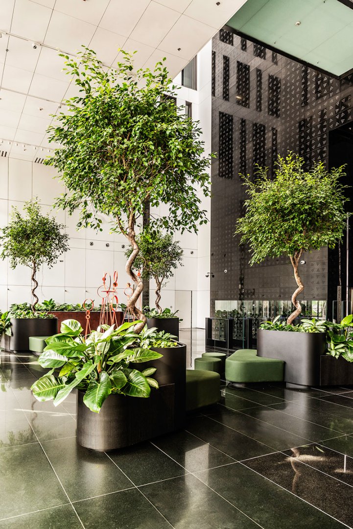 Centrum Bankowo Finansowe charakteryzują duże przestrzenie jednak jego dziedziniec i hol zdominowane są przez kamienną i betonową architekturę. Przy jak najmniejszej ingerencji i określonych możliwościach należało wprowadzić jaka najwięcej roślinności, która nie byłaby dominująca, a byłaby raczej ozdobnikiem dla architektury budynku, jednocześnie stałaby się wizualnym ociepleniem kamiennego otoczenia.