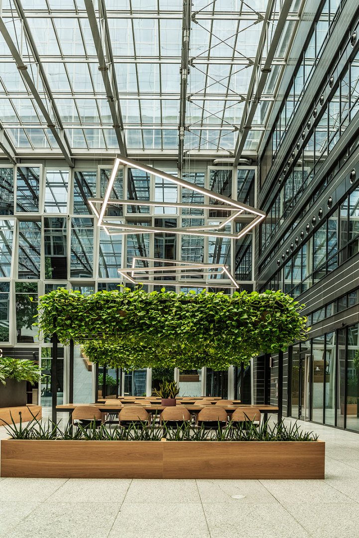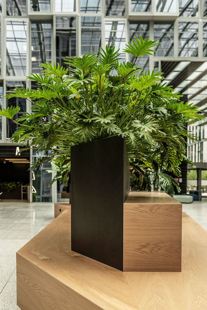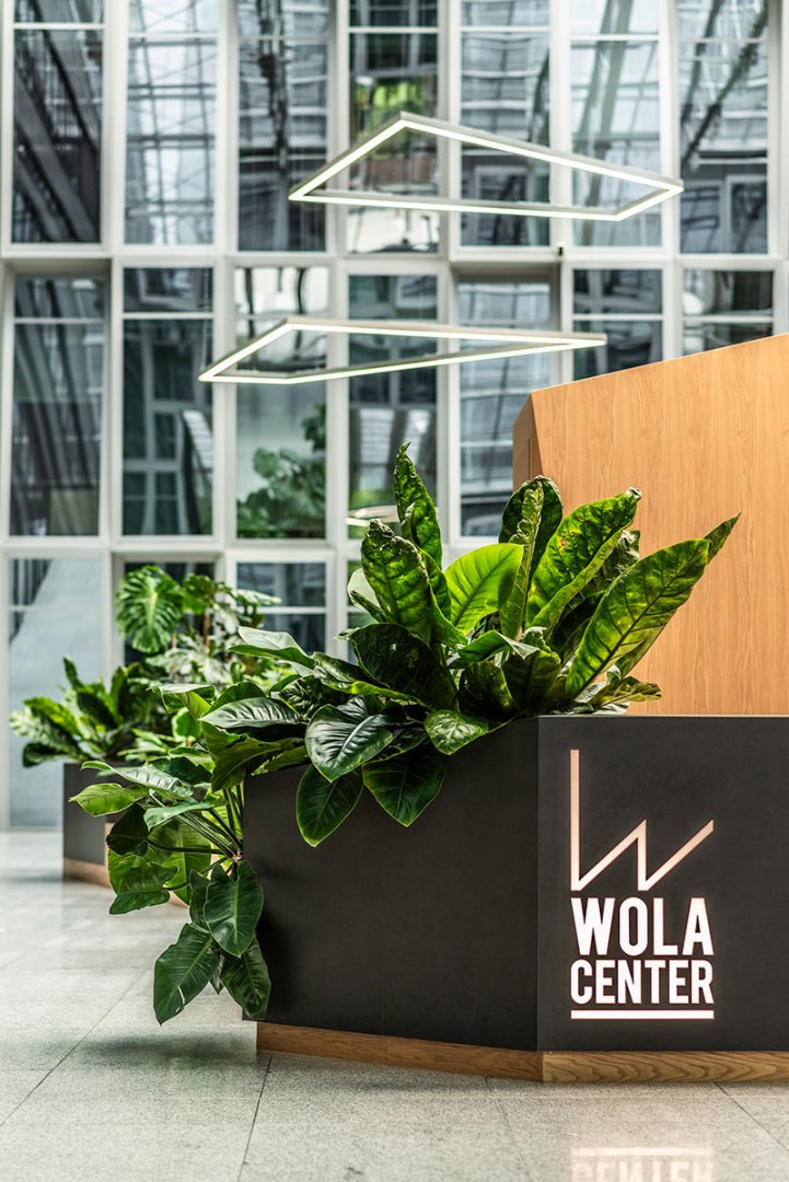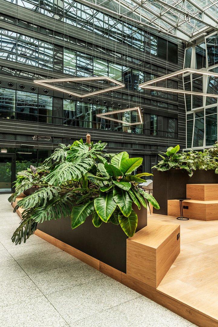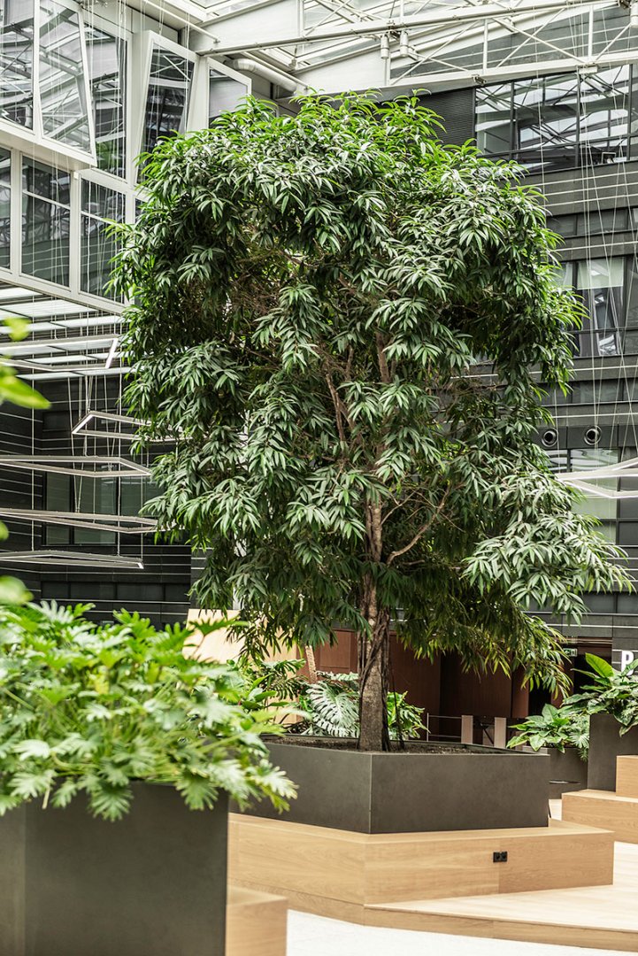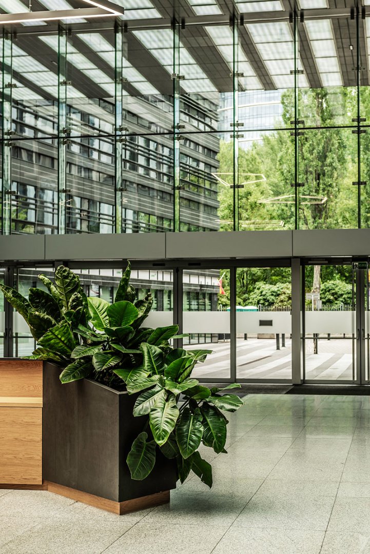 W miejscu nasadzeń wyregulowaliśmy wyrastającą roślinność. W miejscach pustych przestrzeni postawiono kamienne donice nawiązujące i utrzymujące spójność z bryłą i dziedzińcem budynku. W zależności od stopnia naświetlenia dziedzińca wprowadziliśmy zróżnicowaną roślinność, która z jednej strony nie wymagała dużej ilości światła, a z drugiej byłaby odporna na panujący w korytarzu dziedzińca przeciąg i mocne nasłonecznienie w okresie letnim. W holu galerii budynku na ścianie wschodniej wstawnione zostały donice z nasadzonymi niskopiennymi drzewami.