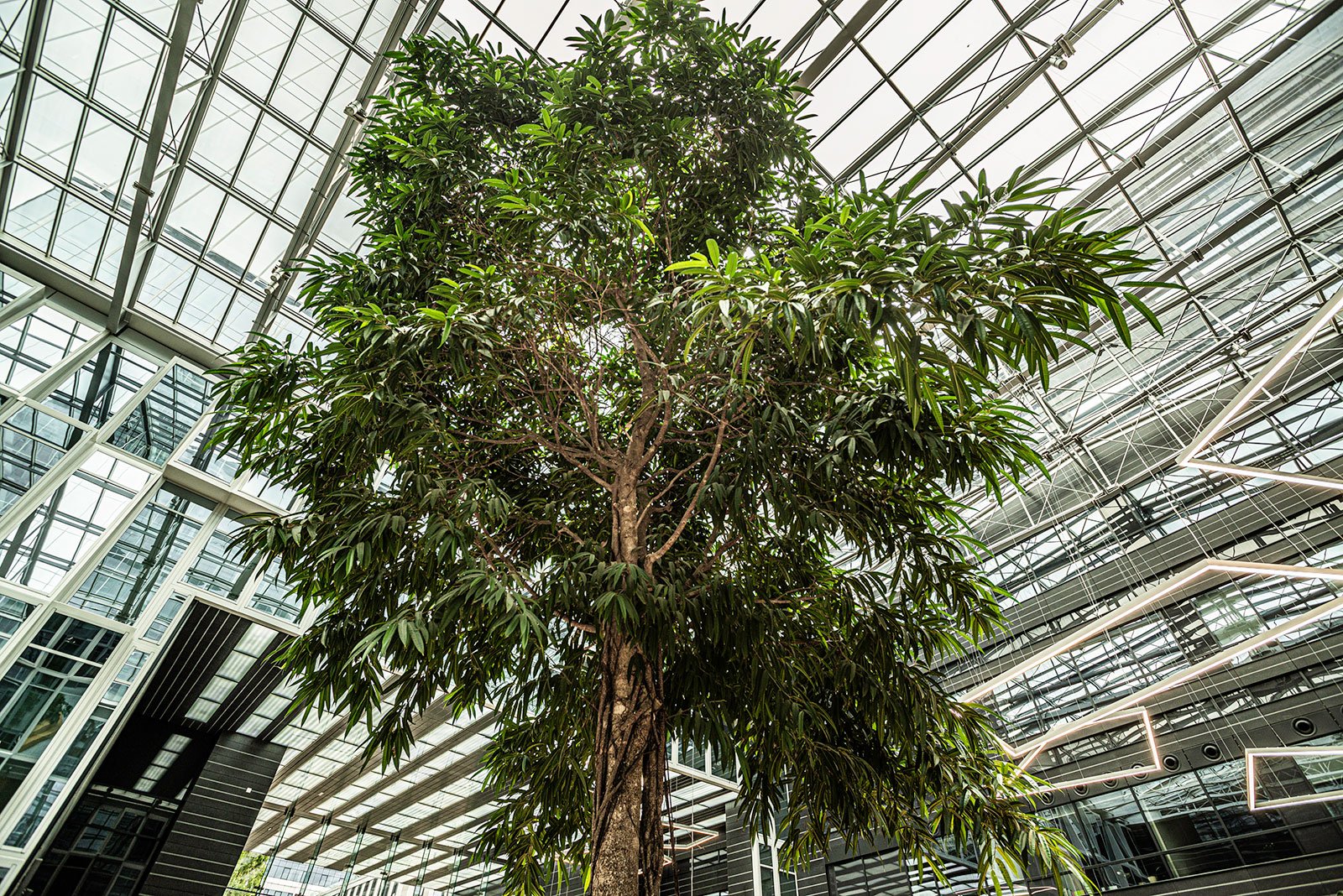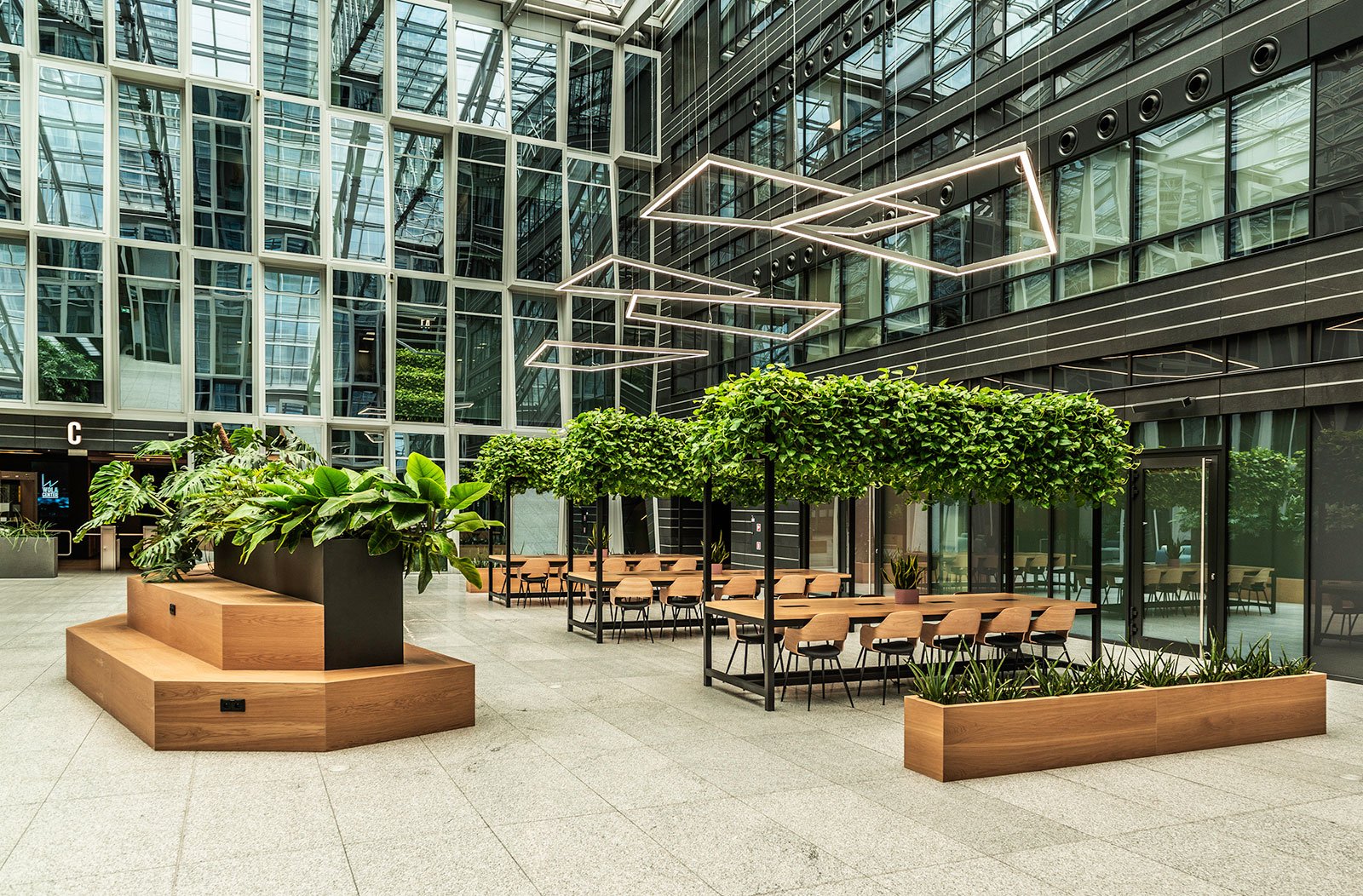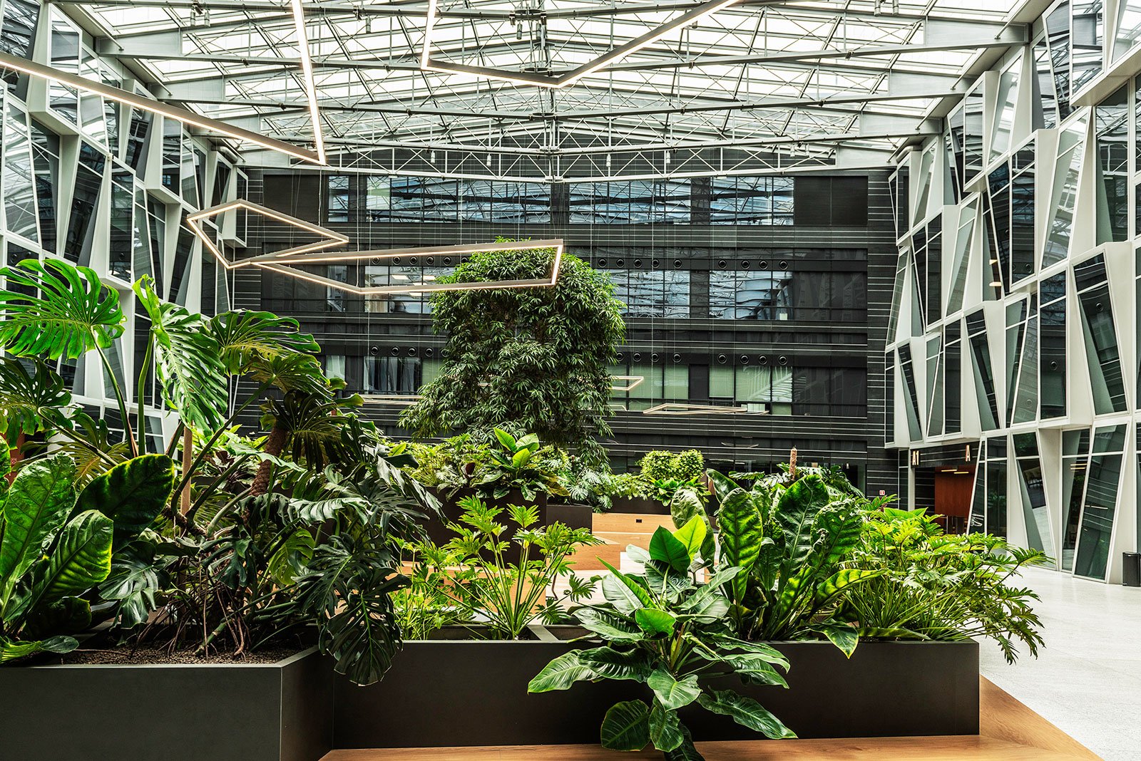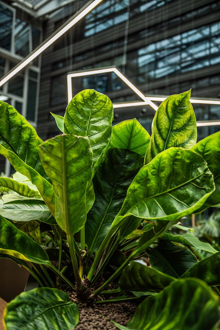 W miejscu nasadzeń wyregulowaliśmy wyrastającą roślinność. W miejscach pustych przestrzeni postawiono kamienne donice nawiązujące i utrzymujące spójność z bryłą i dziedzińcem budynku. W zależności od stopnia naświetlenia dziedzińca wprowadziliśmy zróżnicowaną roślinność, która z jednej strony nie wymagała dużej ilości światła, a z drugiej byłaby odporna na panujący w korytarzu dziedzińca przeciąg i mocne nasłonecznienie w okresie letnim. W holu galerii budynku na ścianie wschodniej wstawnione zostały donice z nasadzonymi niskopiennymi drzewami.