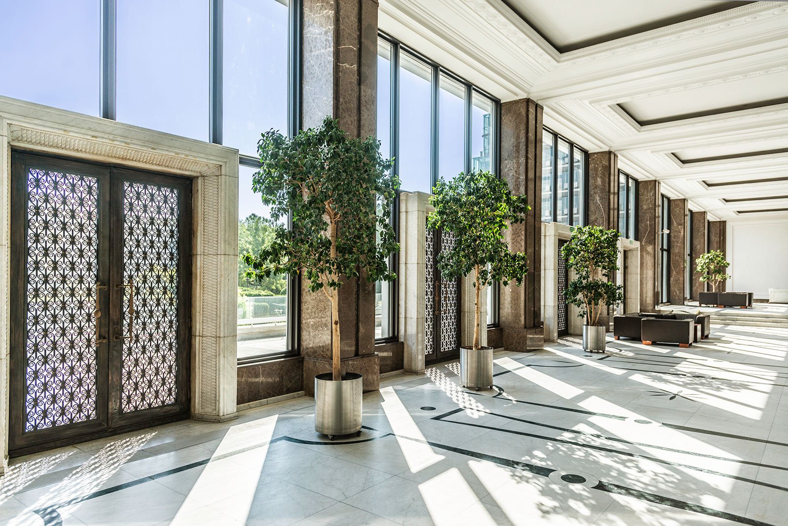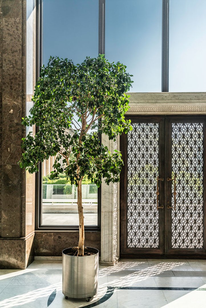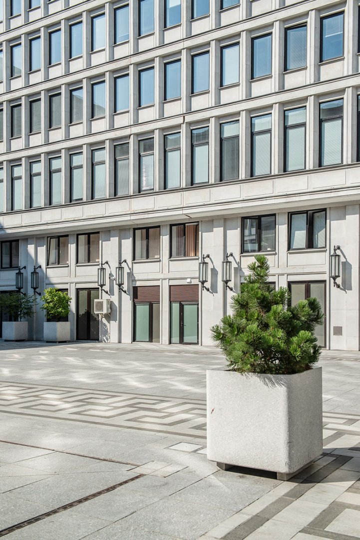 W miejscu nasadzeń wyregulowaliśmy wyrastającą roślinność. W miejscach pustych przestrzeni postawiono kamienne donice nawiązujące i utrzymujące spójność z bryłą i dziedzińcem budynku. W zależności od stopnia naświetlenia dziedzińca wprowadziliśmy zróżnicowaną roślinność, która z jednej strony nie wymagała dużej ilości światła, a z drugiej byłaby odporna na panujący w korytarzu dziedzińca przeciąg i mocne nasłonecznienie w okresie letnim. W holu galerii budynku na ścianie wschodniej wstawnione zostały donice z nasadzonymi niskopiennymi drzewami.