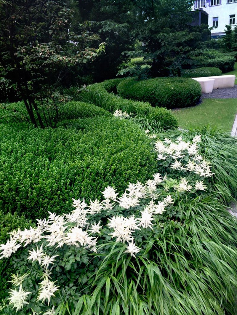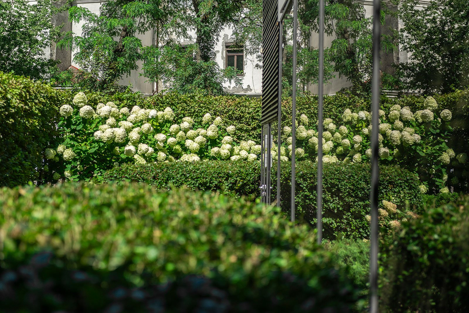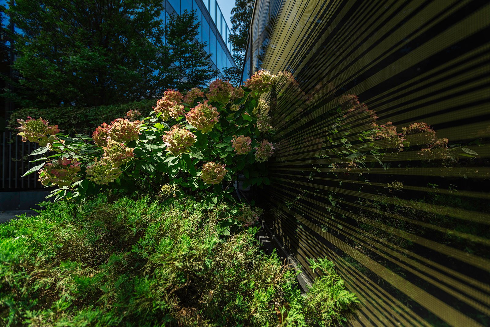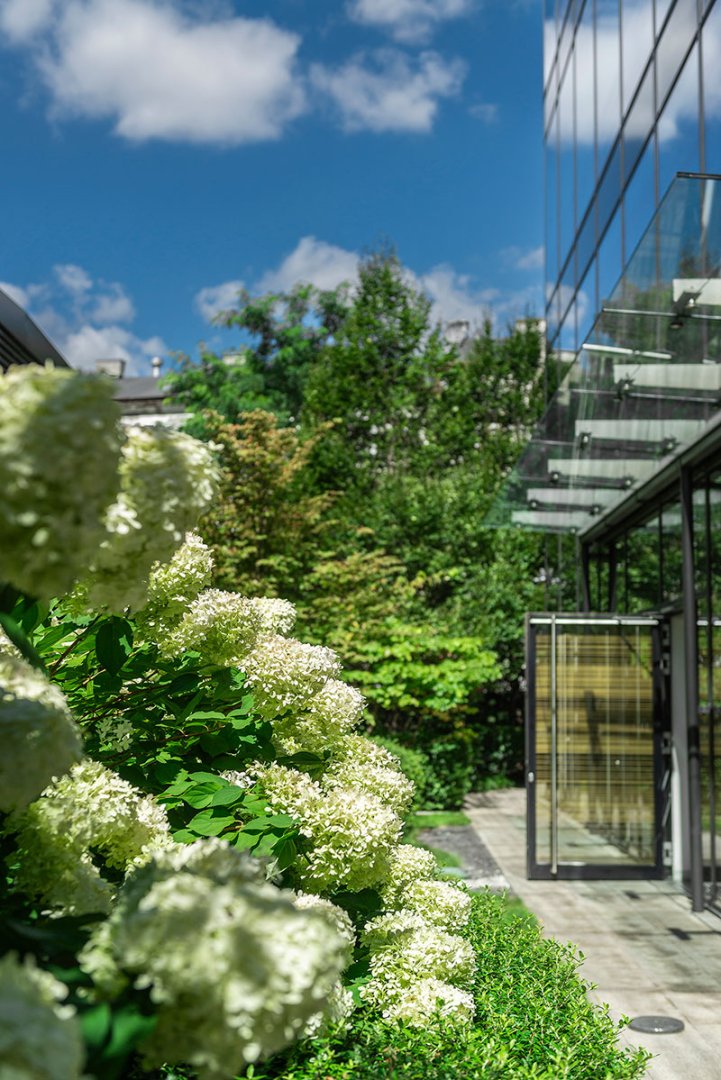 W pasach nasadzeń uporządkowano istniejącą roślinność i przygotowano podłoże pod nowe kompozycje. W miejscach o większej ekspozycji na światło ustawiono smukłe donice o geometrycznej formie, korespondujące z liniami fasady budynku. Wprowadzenie zróżnicowanych gatunków odpornych na zmienne warunki miejskie – silne nasłonecznienie, podmuchy wiatru oraz odbicia ciepła od szklanych ścian – pozwoliło zachować spójność estetyczną, a jednocześnie zwiększyć ilość zieleni. W przestrzeni lobby dodano niskopienne rośliny oraz formowane krzewy, które pełnią funkcję dyskretnej zielonej ramy, nie zakłócając transparentności i otwartości wnętrza. Całość założeń została zrealizowana z zachowaniem minimalnej ingerencji w strukturę architektoniczną budynku.