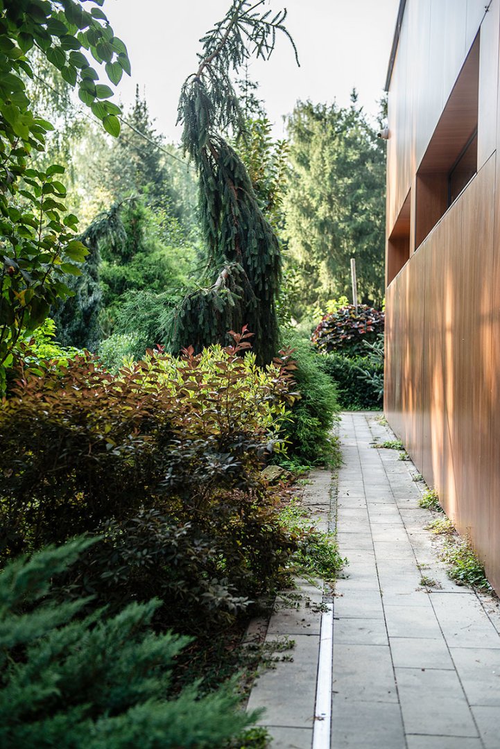 W miejscu nasadzeń wyregulowaliśmy wyrastającą roślinność. W miejscach pustych przestrzeni postawiono kamienne donice nawiązujące i utrzymujące spójność z bryłą i dziedzińcem budynku. W zależności od stopnia naświetlenia dziedzińca wprowadziliśmy zróżnicowaną roślinność, która z jednej strony nie wymagała dużej ilości światła, a z drugiej byłaby odporna na panujący w korytarzu dziedzińca przeciąg i mocne nasłonecznienie w okresie letnim. W holu galerii budynku na ścianie wschodniej wstawnione zostały donice z nasadzonymi niskopiennymi drzewami.