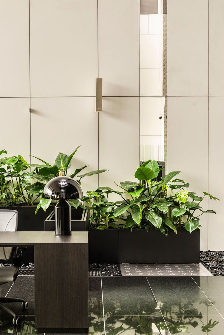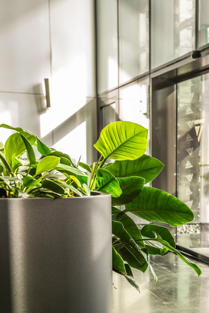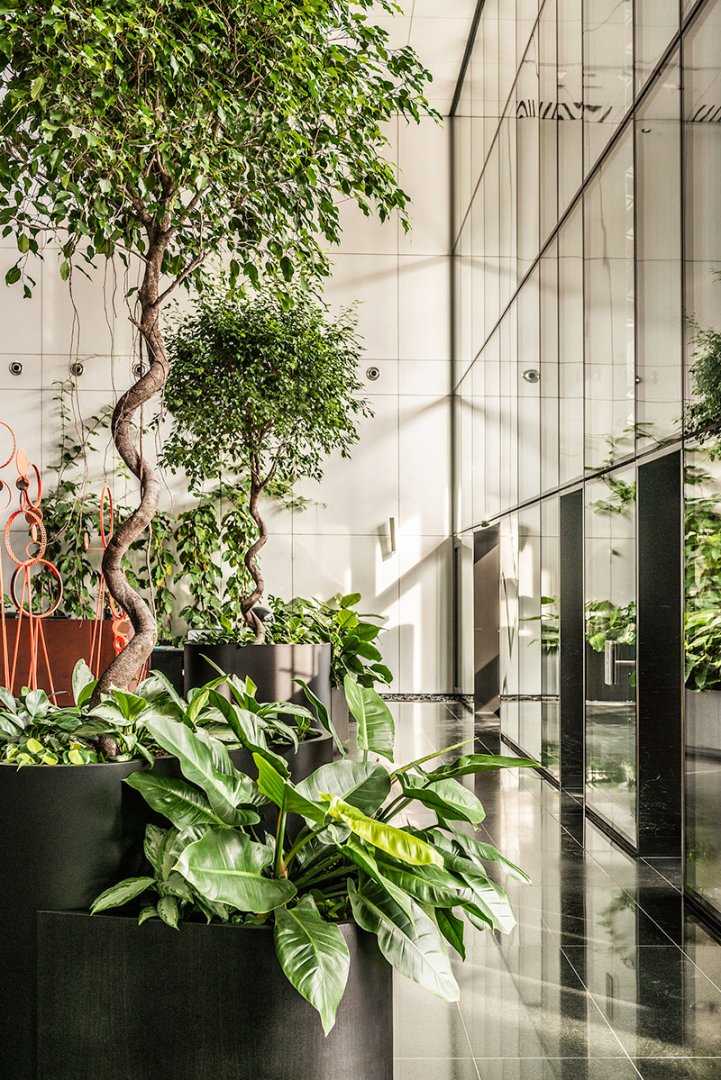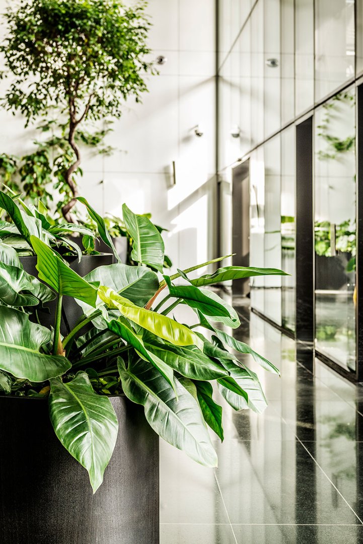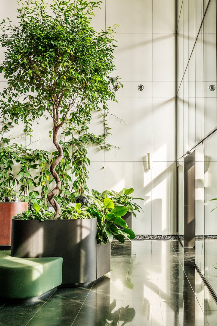 W miejscu nasadzeń wyregulowaliśmy wyrastającą roślinność. W miejscach pustych przestrzeni postawiono kamienne donice nawiązujące i utrzymujące spójność z bryłą i dziedzińcem budynku. W zależności od stopnia naświetlenia dziedzińca wprowadziliśmy zróżnicowaną roślinność, która z jednej strony nie wymagała dużej ilości światła, a z drugiej byłaby odporna na panujący w korytarzu dziedzińca przeciąg i mocne nasłonecznienie w okresie letnim. W holu galerii budynku na ścianie wschodniej wstawnione zostały donice z nasadzonymi niskopiennymi drzewami.
