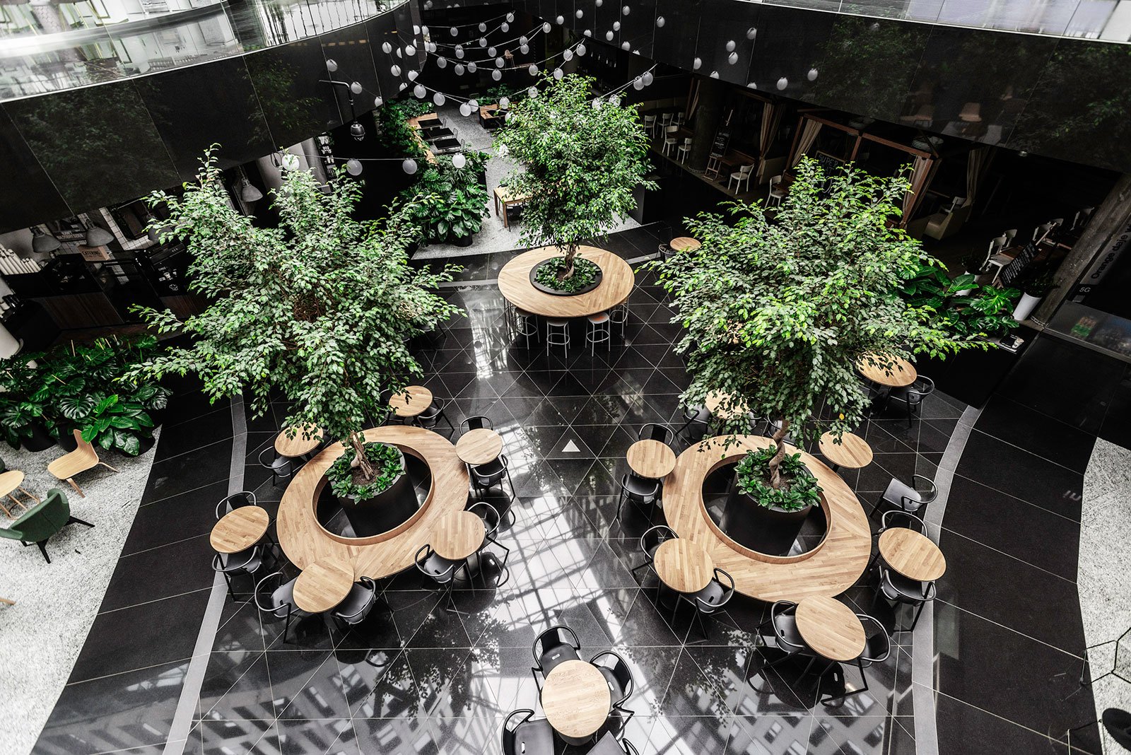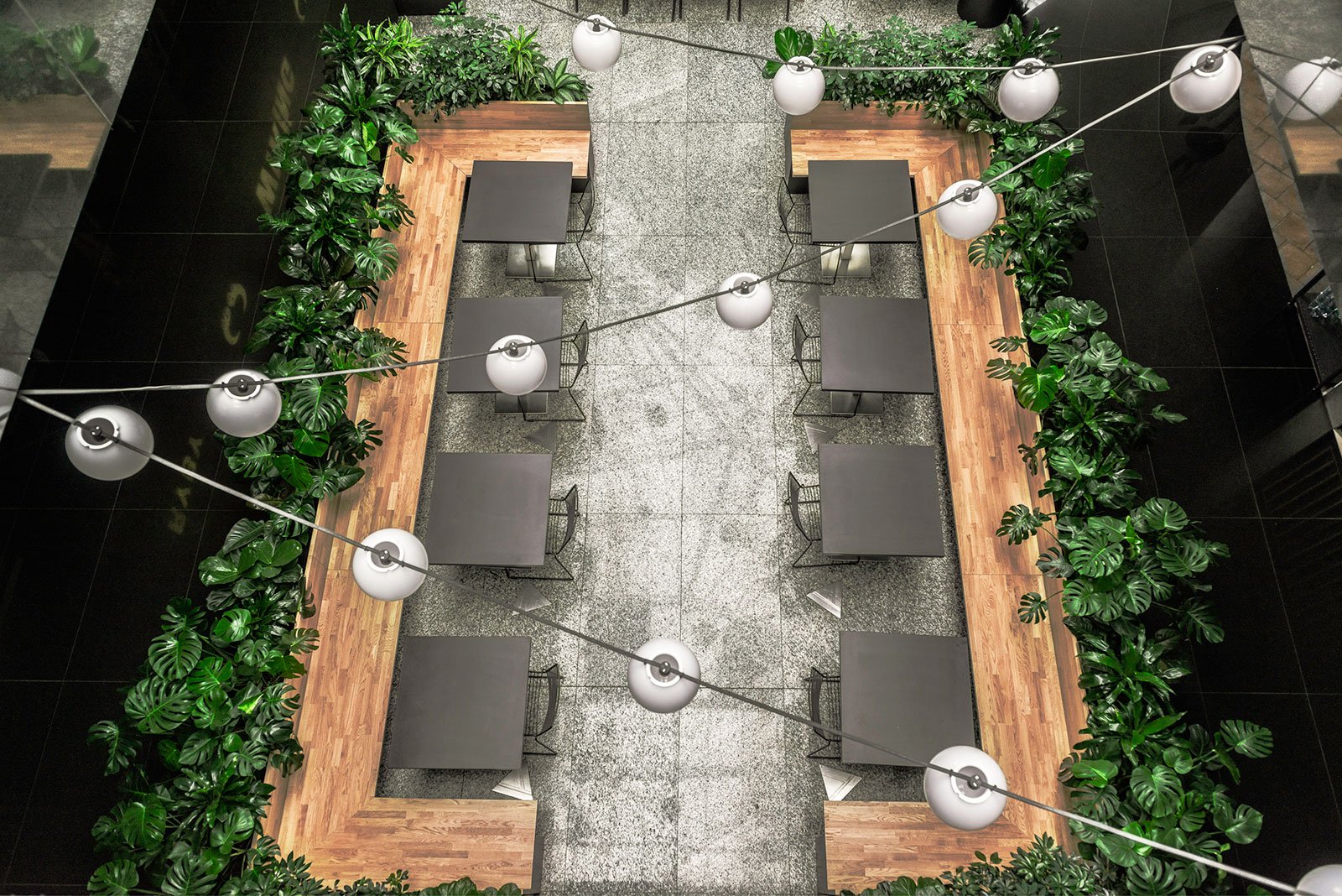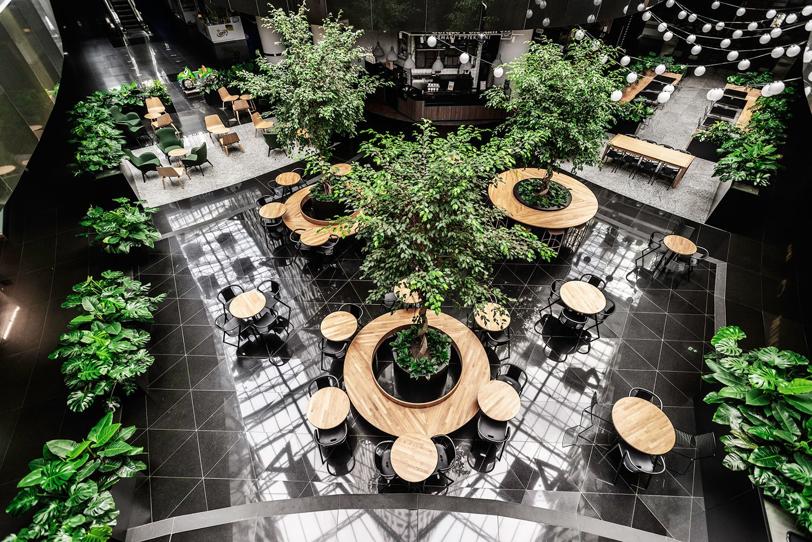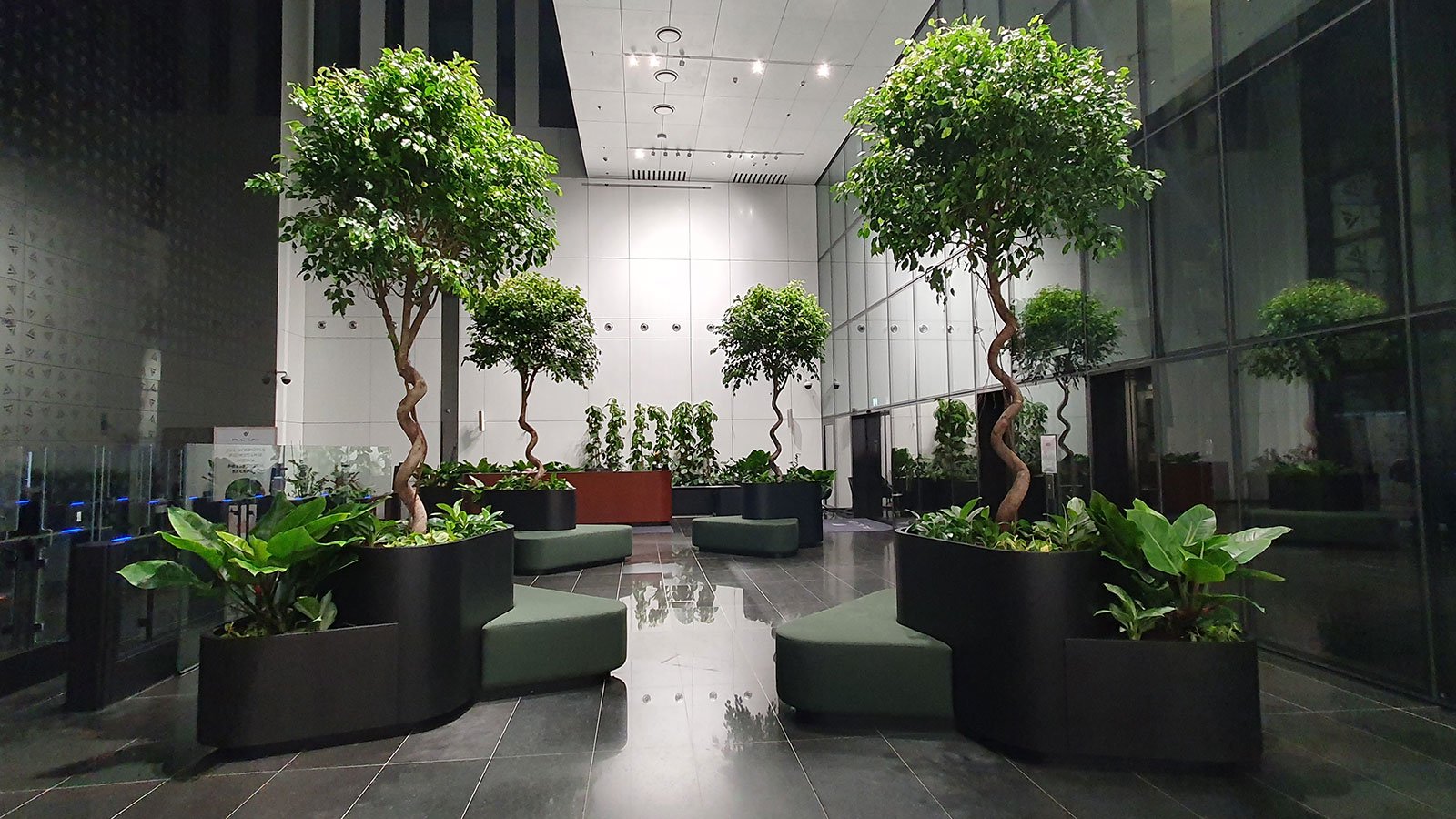 W miejscu nasadzeń wyregulowaliśmy wyrastającą roślinność. W miejscach pustych przestrzeni postawiono kamienne donice nawiązujące i utrzymujące spójność z bryłą i dziedzińcem budynku. W zależności od stopnia naświetlenia dziedzińca wprowadziliśmy zróżnicowaną roślinność, która z jednej strony nie wymagała dużej ilości światła, a z drugiej byłaby odporna na panujący w korytarzu dziedzińca przeciąg i mocne nasłonecznienie w okresie letnim. W holu galerii budynku na ścianie wschodniej wstawnione zostały donice z nasadzonymi niskopiennymi drzewami.