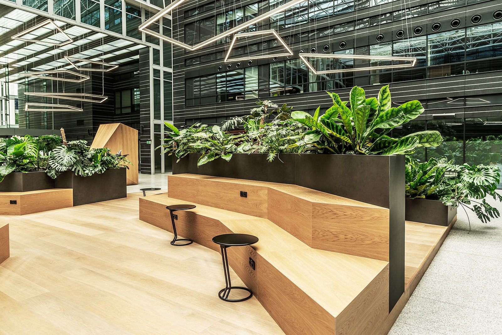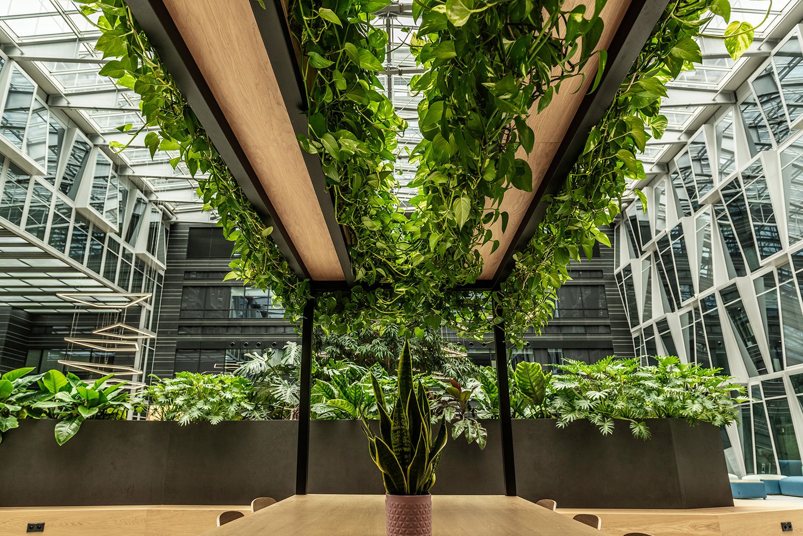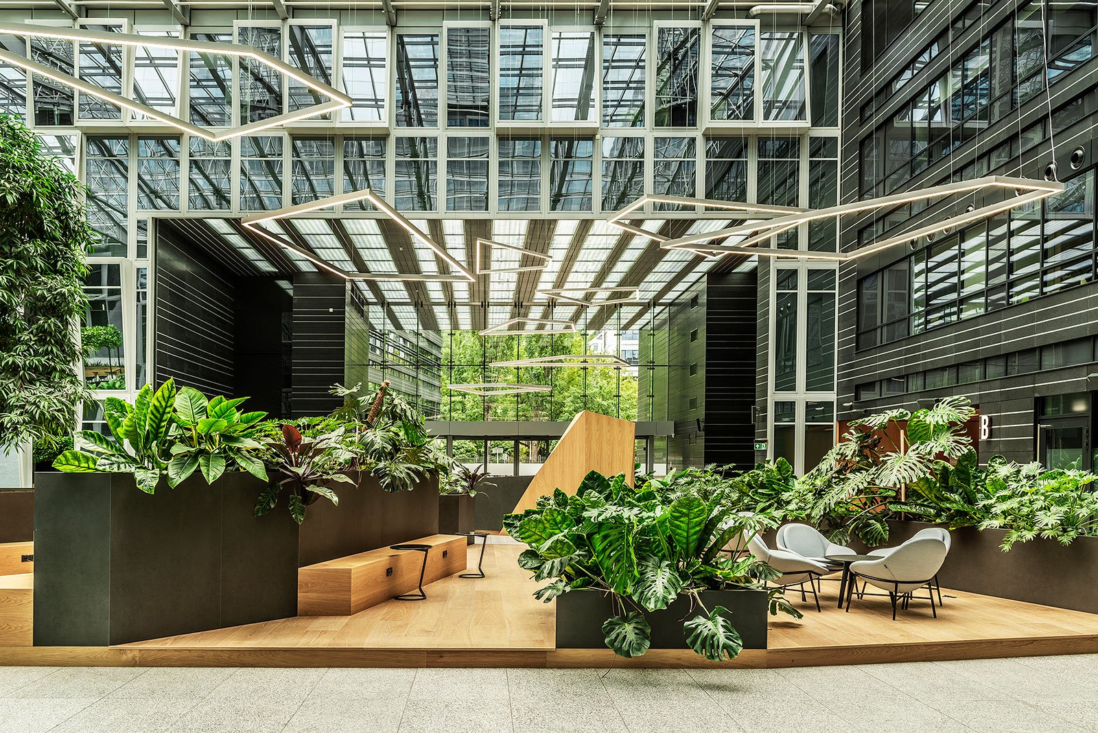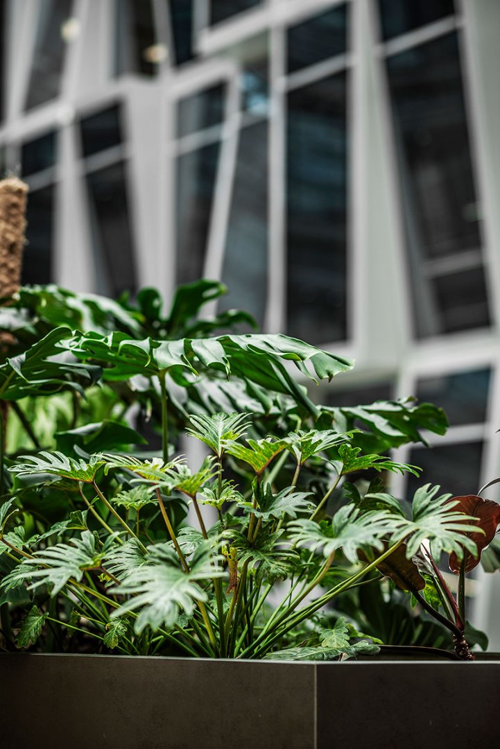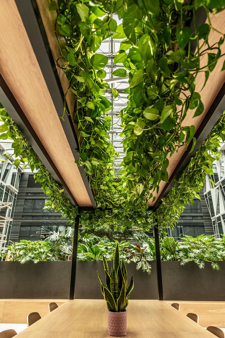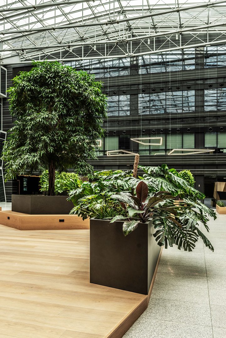 W miejscu nasadzeń wyregulowaliśmy wyrastającą roślinność. W miejscach pustych przestrzeni postawiono kamienne donice nawiązujące i utrzymujące spójność z bryłą i dziedzińcem budynku. W zależności od stopnia naświetlenia dziedzińca wprowadziliśmy zróżnicowaną roślinność, która z jednej strony nie wymagała dużej ilości światła, a z drugiej byłaby odporna na panujący w korytarzu dziedzińca przeciąg i mocne nasłonecznienie w okresie letnim. W holu galerii budynku na ścianie wschodniej wstawnione zostały donice z nasadzonymi niskopiennymi drzewami.